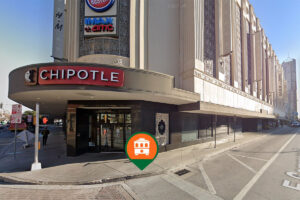 Stop #1 is located at the corner of Alamo Plaza and East Commerce Street, in front of the Chipotle Mexican Grill.
