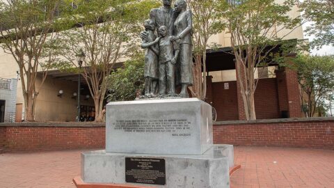 The African-American Monument on River Street was dedicated in 2002 to honor the strength and contributions of African-Americans in Savannah. The bronze sculpture shows a family standing together with broken chains at their feet, a symbol of freedom and resilience. The figures face both the Savannah River and the direction of Africa, tying past and present together. An inscription written by poet Maya Angelou accompanies the monument, offering powerful words of remembrance and hope.