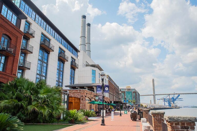 Plant Riverside District was once a 1912 power plant that supplied electricity to Savannah. Today, the restored site is one of the city’s busiest riverfront destinations. Visitors can explore restaurants, rooftop bars, boutique shops, and a hotel that blends into the original industrial design. Inside, there are displays of fossils, minerals, and even a life-sized chrome dinosaur sculpture. Outside, open courtyards often host concerts, art shows, and seasonal festivals, making the west end of River Street a lively place to gather.